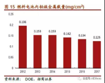 電催化劑的主要作用是促進氫、氧在電極上的氧化還原過程。目前使用的電催化劑主要為鉑碳催化劑,由于鉑是一種貴金屬元素,材料成本占據(jù)主導地位的鉑碳催化劑無法通過量產(chǎn)來降低成本,使得電堆的成本居高不下。因此,未來燃料電池催化劑的研究方向應向低鉑或無鉑催化劑的方向發(fā)展。但是,經(jīng)過多年的發(fā)展,燃料電池電催化劑鉑的擔載量已經(jīng)從2012年的0.196 mg/cm2下降到2017年的0.125mg/cm2,相信未來隨著技術(shù)的進步鉑的擔載量將會進一步降低。