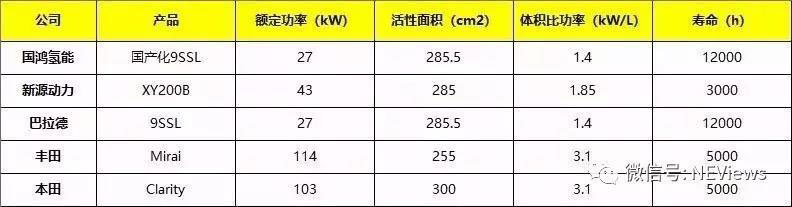 燃料電池乘用車若想能夠商業(yè)化,電堆的壽命至少需要超過5000-10000小時。巴拉德和國鴻氫能的9SSL燃料電池電堆壽命達到了12000小時,可以滿足乘用車對燃料電池壽命的使用要求。但是國產(chǎn)的9SSL電堆使用的是模壓石墨雙極板,這使得電堆的體積功率密度只有1.4KW/L,僅可用于商用車的應用,無法滿足小型乘用車輕量化的需求。豐田的Mirai壽命雖只有5000小時,但是其電堆體積較小,體積功率密度高。下表是國際上幾家主要燃料電池堆生產(chǎn)商的電堆性能對比,從表中可以看出目前燃料電池堆的使用壽命已經(jīng)可以基本滿足商業(yè)化需求,但是在壽命的提高及材料的輕量化上仍然有很長的一段路需要走。