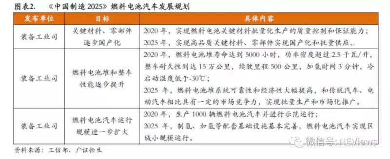 隨著燃料電池產(chǎn)業(yè)發(fā)展逐漸成熟,中國在燃料電池領(lǐng)域的規(guī)劃綱要和政策逐漸清晰,政府從發(fā)展路線、產(chǎn)業(yè)規(guī)劃和補貼扶持全方位支持燃料電池產(chǎn)業(yè)的發(fā)展。2015年我國出臺的《中國制造2025》,關(guān)于節(jié)能與新能源汽車產(chǎn)業(yè)發(fā)展的10年戰(zhàn)略目標,指岀我國燃料電池汽車需要在三個關(guān)鍵方向?qū)崿F(xiàn)突破:關(guān)鍵材料、零部件逐步國產(chǎn)化;燃料電池堆和整車性能逐步提升;燃料電池汽車運行規(guī)模進一步擴大。2017年4月三部委聯(lián)合印發(fā)《汽車產(chǎn)業(yè)中長期發(fā)展規(guī)劃》,進一步明確了以2020年、2025年、2030年為三個關(guān)鍵時間節(jié)點的燃料電池汽車技術(shù)發(fā)展路線。