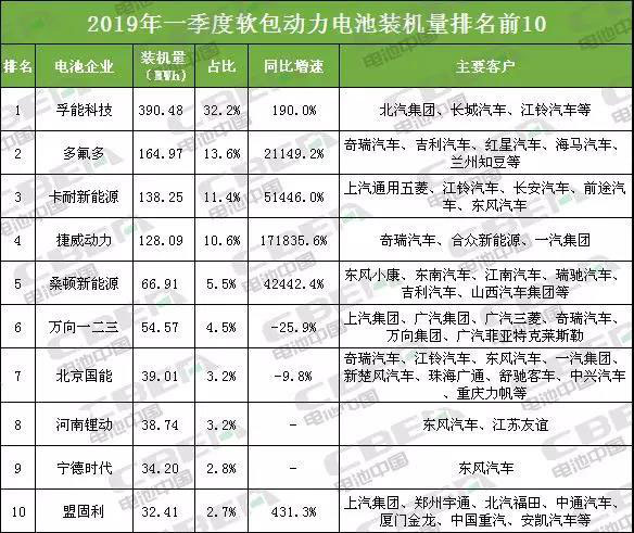 值得注意的是,2019年一季度多氟多、卡耐新能源、捷威動(dòng)力、桑頓新能源等4家企業(yè)的軟包電池裝機(jī)量同比暴增,分別增長了21149.2%、51446.0%、171835.6%、42442.4%。