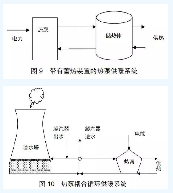 熱電聯(lián)產機組為了調峰進行熱電解耦,導致機組的煤耗顯著增加,降低了系統(tǒng)效率。在前面提到,熱電解耦技術中,有采用大型高效水源或地源熱泵進行供熱的技術路線,即利用電力驅動大型熱泵為居民小區(qū)、醫(yī)院、商場或其他企事業(yè)單位供暖,當熱泵的制熱系數(shù)較高時(現(xiàn)在大型高效熱泵的制熱系數(shù)可以達到5),熱泵所消耗的電量可以小于汽輪機因減少抽汽而增加的發(fā)電量,這樣系統(tǒng)效能大大提高。同時,熱泵如果與儲熱裝置相耦合,還可以顯著提高系統(tǒng)對風電、太陽能發(fā)電的吸納能力,系統(tǒng)示意圖見圖9。