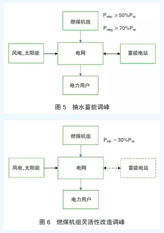 圖5與圖6給出了兩種調峰方式的示意圖,在圖5中,主要由抽水蓄能電站調峰,燃煤機組的最小出力取設計值,一般純凝機組的最小出力Pminc為額定容量Pnc的50%,而供熱機組的最小出力Pming假定為額定容量Pnc的70%(供熱機組的最小出力受機組的熱電比影響較大,此處為假定值,僅用來說明問題)。在圖7中,對燃煤機組做了技術改造,機組的最小出力Pmin可以降至額定容量的30%。
