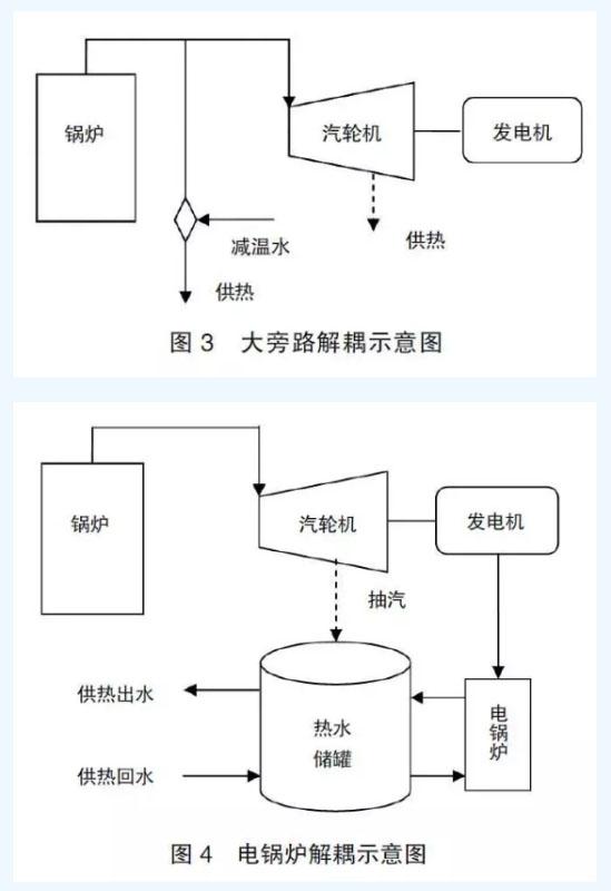 對于熱電聯(lián)產機組,由于其帶有供熱熱負荷,所以汽輪機的最小出力受供熱抽汽量影響很大,因此其改造方式也有不同。為提高其調峰能力,熱電解耦是目前常用的方式:比如大旁路解耦、電鍋爐解耦、電熱泵解耦技術等。