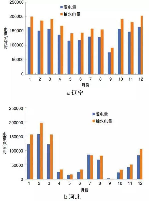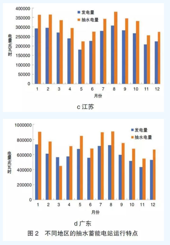 圖2給出了2018年我國幾個典型地區(qū)抽水蓄能電站的運行特點。從圖2a中可以看出,遼寧省抽水蓄能電站在每年的10月到次年的4月發(fā)電量及抽水電量較多,而這一時期正是當?shù)氐墓┡?,燃煤機組的調峰能力受到很大的限制;圖2b及圖2c則給出了河北和江蘇兩個省份的抽水蓄能電站的運行特點,從這兩個省份可以看出,受冬季供暖和夏季空調的影響,在冬季(12月~次年3月)和夏季(7月份、8月份)蓄能電站的發(fā)電量及抽水電量較多,說明其利用小時或設備負荷率較高,其中江蘇省抽水蓄能電站在7月~10月發(fā)電量和抽水電量均較高,是夏季炎熱時間更長的緣故;廣東地區(qū)地處華南,一年中的大部分時間都比較炎熱,所以抽水蓄能電站進入5月份以后到10月都基本保持較高的負荷率,見圖2d。