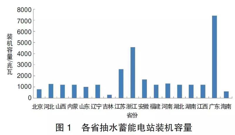 據(jù)中電聯(lián)可靠性管理中心統(tǒng)計,目前在運的單機容量超過4萬千瓦的抽水蓄能電站總容量約為3000萬千瓦(各省裝機容量見圖1)。從圖1中可以看出,廣東、浙江及江蘇抽水蓄能機組建設規(guī)模較大,基本與該省的經濟發(fā)展程度相匹配。而西北廣大風能太陽能資源豐富地區(qū)的抽水蓄能電站建設容量較小或沒有,所以,這也是西北地區(qū)的棄風及棄光率較高的一個重要原因。