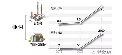 在燃料電池方面,韓國(guó) 政府爭(zhēng)取到 2040 年把燃料電池產(chǎn)量擴(kuò)大至 15GW,這個(gè)過(guò)程是從2018年的(307.6MW)→1.5GW(國(guó)產(chǎn)1GW,2022)→15GW(2040),到2040年在居民和用電領(lǐng)域提供2.1GW(940,000個(gè)家庭)的燃料電池。