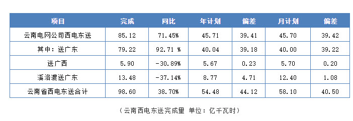 2019 年3月份,云南省西電東送電量實(shí)際完成 98.6 億千瓦時(shí),同比增加 38.7%,比年度計(jì)劃增加44.12億千瓦時(shí)。其中,云南電網(wǎng)公可實(shí)際完成 85.12 億千瓦時(shí) ,比年度計(jì)劃增加39.41億千瓦時(shí) ,溪洛渡實(shí)際完成 13.48億千瓦時(shí) ,比年度計(jì)劃增加4.71億千瓦時(shí)。