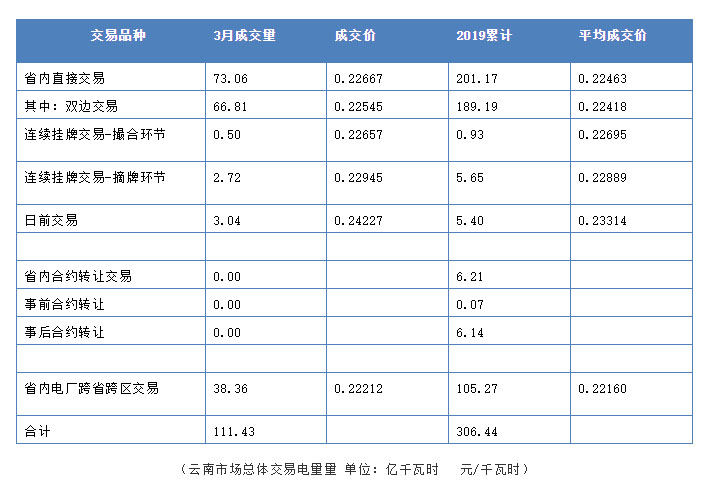2019 年3月,云南省內(nèi)市場(chǎng)化交易電量 73.06 億千瓦時(shí) ,同比增加 6.96% ,平均成交價(jià) 0.22667 元/千瓦時(shí)。