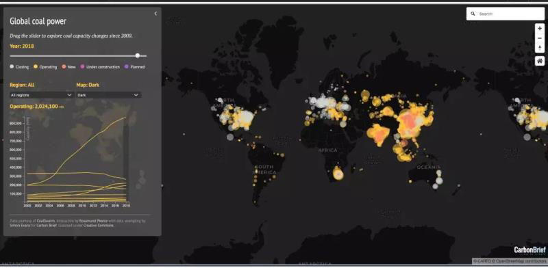 根據(jù)CarbonBrief匯總的數(shù)據(jù),自2000年以來,由于中國和印度的爆發(fā)性增長,全球燃煤發(fā)電裝機翻了一番,2018年在運機組裝機達(dá)到2024吉瓦千兆瓦(GW);此外還有236吉瓦在建、306吉瓦計劃中的煤電機組,186吉瓦在2030年以前退役。