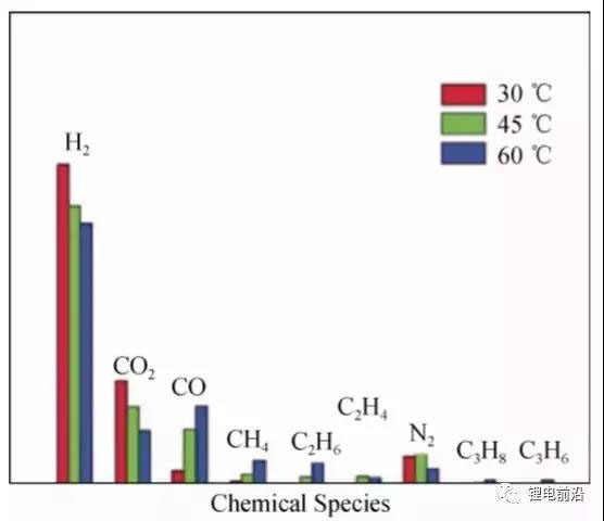 圖8 Li4Ti5O12/LiMn2O4電池在 30、45、60 ℃循環(huán) 5 個(gè)月的氣體成分