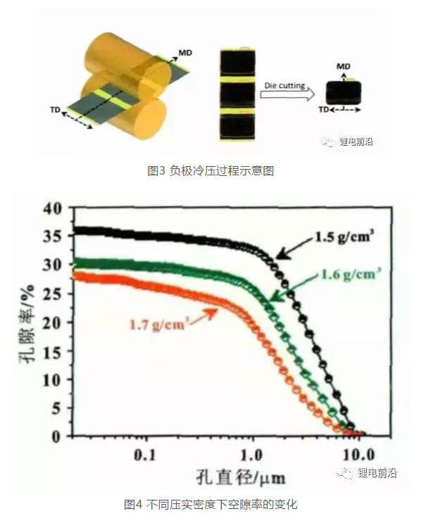 負(fù)極片冷壓時(shí),阻力最小的方向?yàn)镸D方向(極片的Y方向,如圖3所示),應(yīng)力在MD方向更容易釋放,而TD方向(極片的X方向)阻力較大,輥壓過(guò)程應(yīng)力不易釋放,TD方向應(yīng)力較MD方向大。故導(dǎo)致電極片滿充后,X方向膨脹率大于Y方向膨脹率.另一方面,壓實(shí)密度增大,極片孔隙容量降低(如圖4所示),當(dāng)充電時(shí),陽(yáng)極膜層內(nèi)部沒(méi)有足夠的空間吸收石墨膨脹的體積,外在表現(xiàn)為極片整體向X、Y、Z三個(gè)方向膨脹。從圖2(c)、(d)可以看出,涂布質(zhì)量從0.140g/1,540.25mm2增大到0.190g/1,540.25mm2,X方向膨脹率從0.84%增大到1.15%,Y方向膨脹率從0.89%增大到1.05%,Z方向膨脹率趨勢(shì)與X/Y方向變化趨勢(shì)相反,呈下降趨勢(shì),從16.02%降低到13.77%。說(shuō)明石墨陽(yáng)極膨脹在X、Y、Z三個(gè)方向呈現(xiàn)此起彼伏的變化規(guī)律,涂布質(zhì)量變化主要體現(xiàn)在膜層厚度的顯著變化。以上負(fù)極變化規(guī)律與文獻(xiàn)結(jié)果一致,即集流體厚度與膜層厚度比值越小,集流體中應(yīng)力越大。