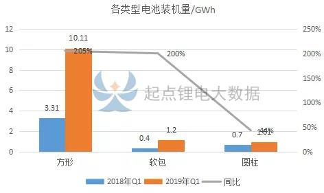 起點(diǎn)研究院(SPIR)數(shù)據(jù)顯示,2019年一季度國(guó)內(nèi)動(dòng)力電池總裝機(jī)量為12.32GWh,其中方形電池裝機(jī)量10.11GWh,同比增長(zhǎng)205%,軟包電池裝機(jī)量1.2GWh,同比增長(zhǎng)200%,圓柱電池裝機(jī)量1.01GWh,同比增長(zhǎng)44%。