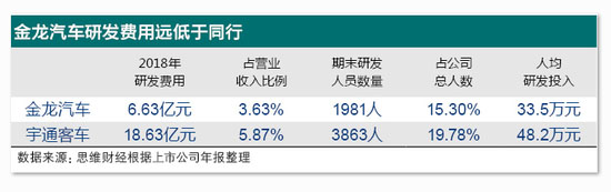 由此看來,自身產(chǎn)品競(jìng)爭(zhēng)力不足、長年依賴補(bǔ)貼,或是公司盈利水平較低的更深層次原因。事實(shí)上,金龍汽車研發(fā)費(fèi)用投入在行業(yè)內(nèi)一直處于中等水平,遠(yuǎn)低于競(jìng)爭(zhēng)對(duì)手宇通客車,以2018年年報(bào)為例,2018年金龍汽車研發(fā)費(fèi)用6.63億,人均研發(fā)投入約為33.5萬元;同期宇通客車研發(fā)費(fèi)用為18.63億,人均研發(fā)投入約為48.2萬元。