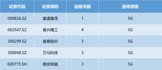 5G概念板塊今日沖高回落,再次小幅微漲。富通鑫茂(000836.SZ)、春興精工、富春股份、萬(wàn)馬科技、南京熊貓等個(gè)股漲停。