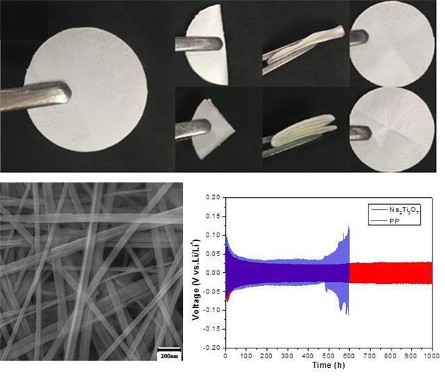 這種隔膜由超長納米帶編織而成,特性一是柔韌性好,不需要任何粘結劑的條件下,能反復折疊百余次不發(fā)生破壞;特性二是穩(wěn)定性強,在超聲、溶劑浸泡等各種苛刻條件處理后結構不變,經過1000度熱處理后隔膜幾何尺寸不發(fā)生變化;特性三是適用性高,鈦酸鈉隔膜電化學窗口超過4.2伏,可滿足常規(guī)鋰離子電池的需要,采用這種純無機隔膜組裝的電池在零下20度到75度之間均表現(xiàn)出優(yōu)異的充放電性能。與商業(yè)有機隔膜相比,純無機隔膜抗鋰枝晶穿刺的能力大大增強,有望在高性能鋰離子電池中得到應用。