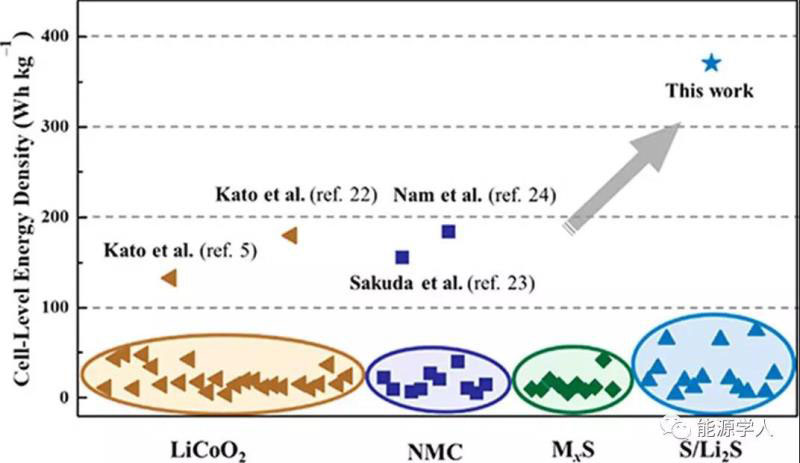Figure 7. 使用硫化物電解質(zhì)的全固態(tài)電池的電池水平能量密度。不同正極的電池用不同的顏色表示。電流集流體的重量不包括在計(jì)算中,并且該工作的電池水平能量密度是基于第一次循環(huán)的可逆容量計(jì)算的。