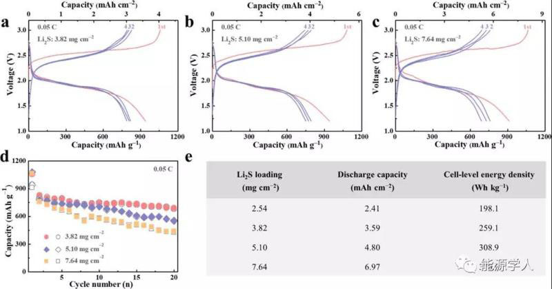 Figure 6. (a-c)在25℃的溫度下,Li2S載量分別為(a)3.82,(b)5.10,和(c)7.64mg/cm2正極支撐的全固態(tài)Li-Li2S電池在0.05C的倍率下充放電曲線;(d)不同Li2S載量正極支撐的全固態(tài)Li-Li2S電池的循環(huán)性能;(e)具有不同Li2S載量正極支撐的全固態(tài)Li-Li2S電池的電池水平能量密度。