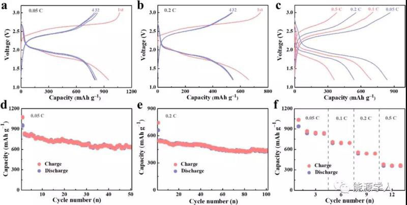 Figure 5.(a-c)在25℃的溫度下,正極支撐的全固態(tài)Li-Li2S電池在(a)0.05C,(b)0.2C和(c)0.05至0.5C的不同倍率下的充放電曲線;(d, e)在25℃的溫度下,正極支撐的全固態(tài)Li-Li2S電池在(d)0.05和(e)0.2C倍率下的循環(huán)性能;(f)在25℃的溫度下,正極支撐的全固態(tài)Li-Li2S電池的倍率性能。比容量是基于正極復(fù)合材料中Li2S 的質(zhì)量計(jì)算,Li2S負(fù)載量為2.54mg/cm2。