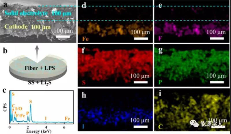 Figure 4. (a)ASSLB橫截面SEM圖像;(b)ASSLB示意圖;(c)ASSLB正極復(fù)合材料EDS;(d-i)分別為Fe,F(xiàn),S,P,I和C的元素映射。