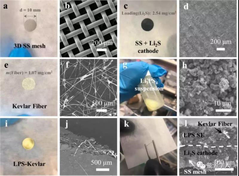 Figure 3. (a, b)SS網(wǎng)的光學(xué)照片和SEM圖像;(c, d)SS-Li2S復(fù)合正極的光學(xué)照片和SEM圖像;(e, f)Kevlar非織造支架的光學(xué)照片和SEM圖像;(g)Li3PS4電解質(zhì)懸浮液;(h)Li3PS4從懸浮液中干燥之后SEM圖像;(i, j)Li3PS4-Kevlar電解質(zhì)的光學(xué)照片和SEM圖像;(k, l)SS網(wǎng)負(fù)載正極和Li3PS4-Kevlar電解質(zhì)的光學(xué)照片和SEM圖像。