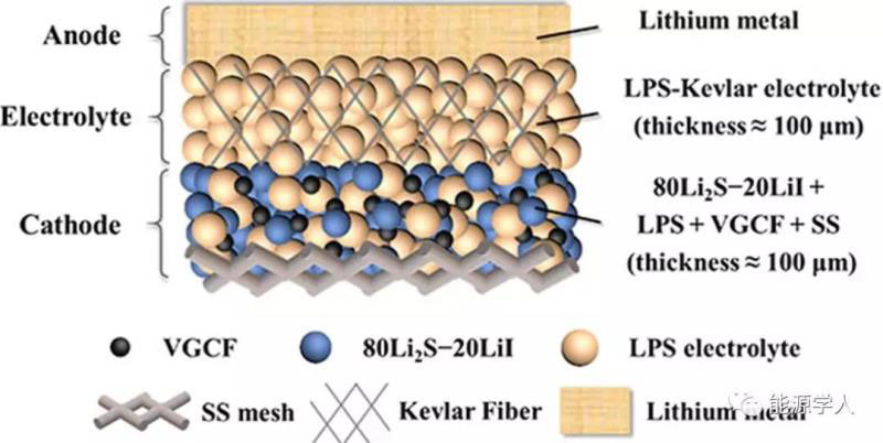 將活性材料與氣相生長碳纖維(VGCF)和LPS電解質(zhì)按重量比為75:10:15混合以制備正極。Li2S在正極復(fù)合材料中的含量為43.4wt%,這是所有報(bào)道的基于Li2S正極的全固態(tài)電池中的最高值。首先,將得到的正極粉末與聚四氟乙烯(PTFE)粘合劑混合,在研缽中研磨,然后卷成薄片,將制備好的正極薄膜冷壓到SS網(wǎng)狀集電器上。其次,通過將甲苯中LPS懸浮液滴加到Kevlar非織造支架中,隨后在真空下干燥過夜來制備薄電解質(zhì)層。最后,將LPS-Kevlar電解質(zhì)冷壓在正極膜上,將薄的Li金屬附著到固體電解質(zhì)的頂側(cè)以形成全固態(tài)全電池。值得注意的是,本文中LPS與Li不是熱力學(xué)穩(wěn)定的,而是通過形成鈍化界面來實(shí)現(xiàn)界面穩(wěn)定性。這種全固態(tài)電池的示意圖如圖2所示。
