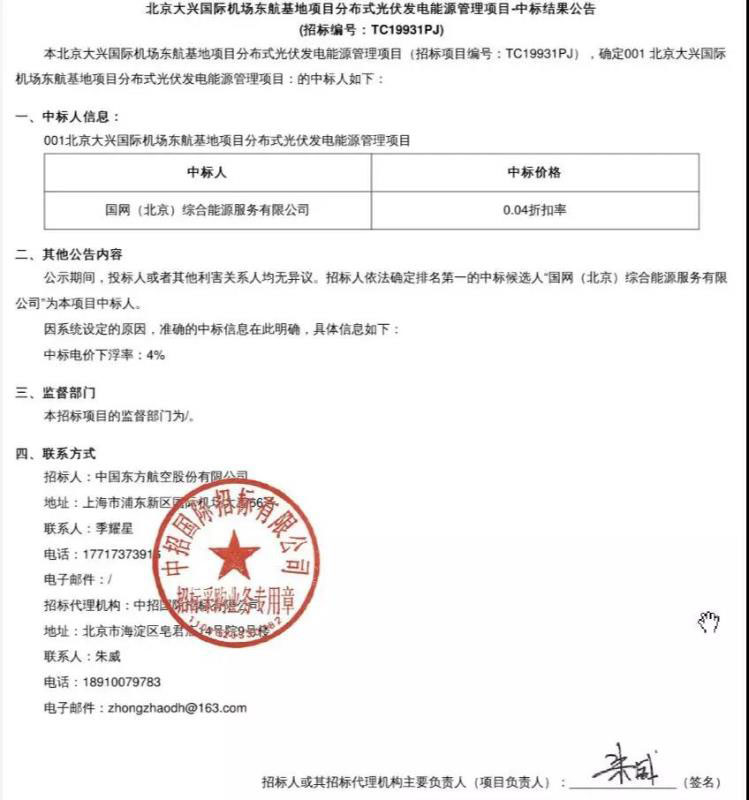 中國(guó)儲(chǔ)能網(wǎng)訊:4月23日,北京大興國(guó)際機(jī)場(chǎng)東航基地項(xiàng)目分布式光伏發(fā)電能源管理項(xiàng)目中標(biāo)結(jié)果公告發(fā)布。國(guó)網(wǎng)(北京)綜合能源服務(wù)有限公司以第一中標(biāo)候選人的成績(jī)中標(biāo)。
