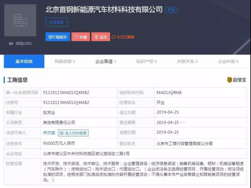 新能源汽車產(chǎn)業(yè)再迎強勁玩家,4月25日,北京首鋼新能源汽車材料科技有限公司正式成立,法定代表人為齊杰斌,注冊資本9.5億元人民幣。