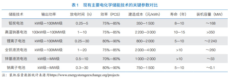 在能源革命的黃金時代,各類電化學儲能技術需針對其細分市場進行差異化發(fā)展。然而無論對于哪一種儲能技術,其必須滿足?3?個基本要求:安全性高,全生命周期的性價比高,以及全生命周期的環(huán)境負荷低。目前,技術成熟度較高的鋰離子電池、全釩液流電池和鉛炭電池等電化學儲能技術都基本實現(xiàn)市場運營,在不斷發(fā)展的能源格局中迭代發(fā)展,其基本技術參數(shù)列于表?1。在未來?20?年內,這些技術有望占領絕大部分電化學儲能市場。