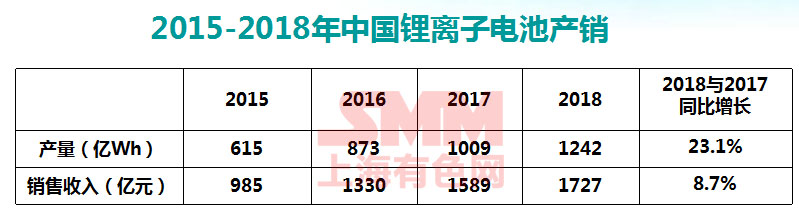 根據(jù)中國化學(xué)與物理電源行業(yè)協(xié)會(huì)統(tǒng)計(jì)分析,2018年中國鋰離子電池銷售收入達(dá)到1727億元,比2017年的1589億元,同比增長(zhǎng)8.7%。鋰離子電池的產(chǎn)量由1009億瓦時(shí)增長(zhǎng)到1242億瓦時(shí),同比增長(zhǎng)23.1%。主要是由新能源汽車動(dòng)力電池和儲(chǔ)能電池市場(chǎng)的快速增長(zhǎng)。