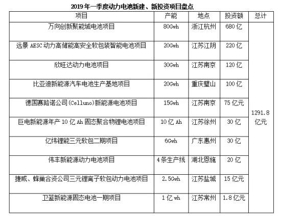 據(jù)不完全統(tǒng)計(jì),2019年一季度動(dòng)力電池新建、投資項(xiàng)目達(dá)10個(gè),總產(chǎn)能超170Gwh,總投資額達(dá)1291.8億元。