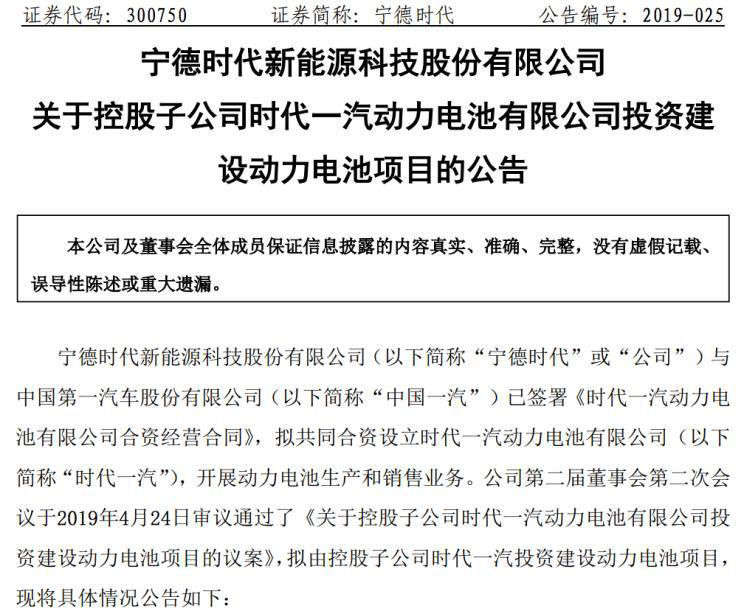 4月25日,動(dòng)力電池企業(yè)寧德時(shí)代新能源科技股份有限公司(簡(jiǎn)稱“寧德時(shí)代”)發(fā)布公告表示,公司與中國(guó)第一汽車(chē)股份有限公司(簡(jiǎn)稱“中國(guó)一汽”)已簽署《時(shí)代一汽動(dòng)力電池有限公司合資經(jīng)營(yíng)合同》,擬共同合資設(shè)立時(shí)代一汽動(dòng)力電池有限公司(簡(jiǎn)稱“時(shí)代一汽”),開(kāi)展動(dòng)力電池生產(chǎn)和銷(xiāo)售業(yè)務(wù)。