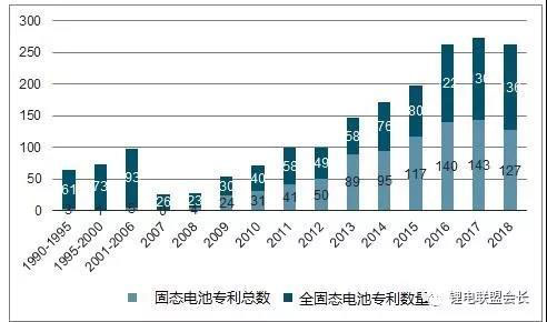 從數(shù)量上來看,固態(tài)電池領(lǐng)域?qū)@麛?shù)目由2007年26件增長至 2017年273件,增長超過10倍,同時全固態(tài)電池專利數(shù)目占比由零提升至近一半,說明固態(tài)電池尤其是全固態(tài)電池的研發(fā)越來越受到各方面的重視。