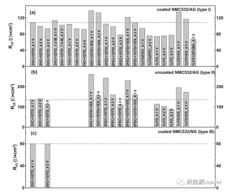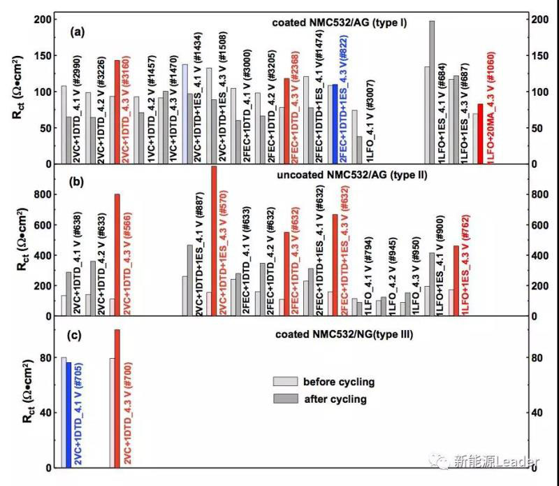 下圖為幾種電池化成后的Rct(電荷交換阻抗)的數值(電池分別采用4.1V、4.2V和4.3V三種截止電壓),從下圖a(涂層單晶NCM523(21.1mg/cm2)/人造石墨(12.4mg/cm2))能夠看到多數電池隨著充電截止電壓的提高,Rct都會變的更低,只有電解液中僅含有LFO的電池不同截止電壓下電池的Rct都很低。同時我們對比下圖a和c還能夠發(fā)現采用天然石墨的電池的Rct要比采用人造石墨的電池更低,同時加入ES添加劑也會導致更高的Rct。