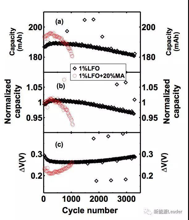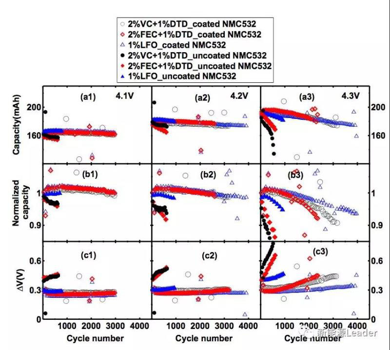 采用2%FEC+1%DTD的涂層NCM523電池在4.3V循環(huán)2000次后出現了容量跳水的現象,采用1%LFO電解液的非涂層NCM523電池在循環(huán)700次后出現容量跳水的現象,而采用2%VC+1%DTD電解液的涂層NCM523電池在4.3V循環(huán)2500次后出現容量跳水,采用1%LFO電解液的涂層NCM523電池在循環(huán)超過4000次后仍然沒有出現容量跳水的現象。