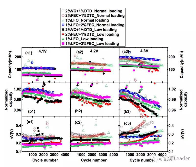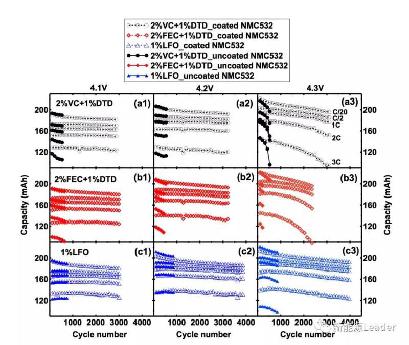 在上述電池循環(huán)過程中,作者每循環(huán)100次就對電池在C/20、C/2、1C、2C和3C倍率下的放電能力進行了測試(結果如下圖所示,每張圖片自上而下分別為C/20、C/2、1C、2C、3C的容量變化),從圖中能夠看到非涂層NCM523/石墨電池在4.3V下循環(huán)時3C放電容量衰降的非???,這其中采用2%FEC+1%DTD電解液的電池的3C放電容量的衰降速度要明顯快于2%VC+1%DTD的電池,而采用1%LFO電解液的電池的3C放電能力在經過4000次循環(huán)后仍然沒有非常顯著的衰降,這也表明了電解液添加劑的重要性。