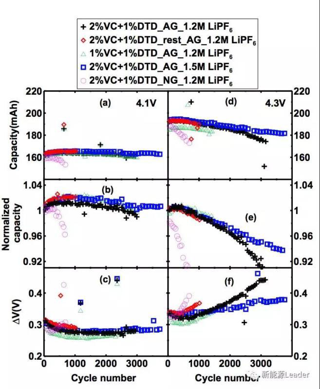 下圖為采用人造石墨和天然石墨的電池使用不同電解液時的循環(huán)性能,從下圖能夠發(fā)現涂層NCM523/天然石墨的電池采用2%VC+1%DTD會導致電池的循環(huán)壽命急劇衰降,而如果僅將負極更換為人造石墨循環(huán)性能就會大幅改善。同時從下圖我們還能夠注意到去掉靜置時間、提高LiPF6濃度,以及添加2%VC+1%DTD都能夠有效的提高涂層NCM523/人造石墨在4.3V下的循環(huán)性能。