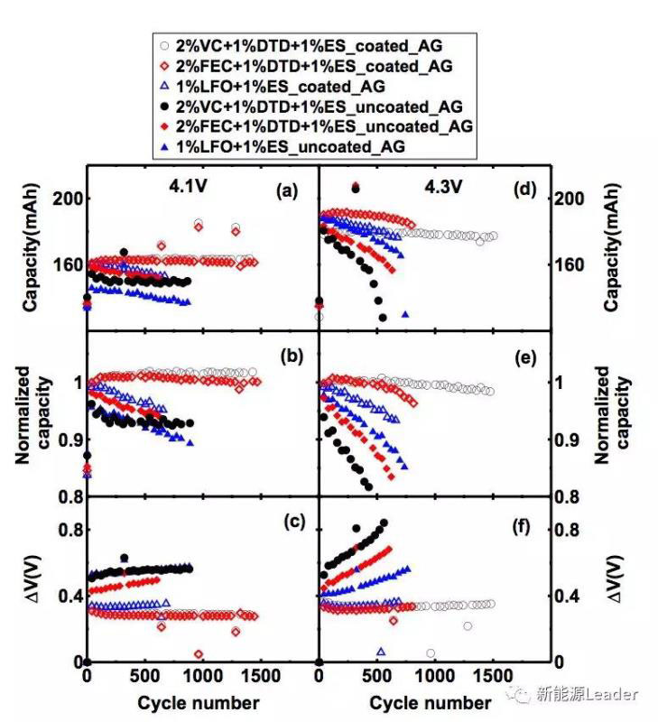 下圖為涂層NCM523/人造石墨電池和非涂層NCM523/人造石墨分別采用不同添加劑的電解液,在4.1V、4.2V和4.3V下的循環(huán)數據(1C充/1C放),從下圖能夠看到沒有非涂層NCM523/人造石墨電池在循環(huán)性能上要比有涂層NCM523/人造石墨電池更差,電池內阻也增加的更快,如果在電解液中加入1%LFO后能夠改善非涂層NCM523電池的循環(huán)性能。同時我們從下圖也能夠注意到隨著電池充電截止電壓的升高,所有的電池的循環(huán)性能都會出現明顯的下降,涂層NCM523/人造石墨電池在4.1V和4.2V循環(huán)4000千次后容量衰降仍然非常輕微,而充電截止電壓提高到4.3V后容量衰降就變的非常明顯。