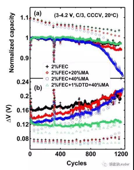 下圖為涂層NCM523/人造石墨電池采用不同電解液時的循環(huán)性能,在電解液中添加20%的MA能夠顯著的提升電池的倍率性能,但是卻會導致電池的循環(huán)性能嚴重劣化。