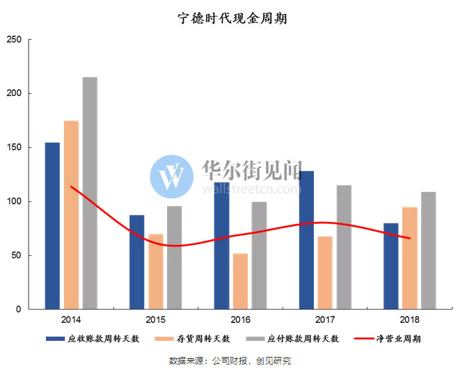 進一步拆解現金周期(凈營業(yè)周期)來看,寧德時代的應收賬款周轉天數相對平穩(wěn),2018年甚至逆勢出現下降;應付賬款周轉天數自2015年以來也呈上升趨勢,顯示其與供應商的信任程度不斷加深。唯一美中不足的是存貨 周轉天數的增長,但對一家銷量呈指數增長的公司來說,一定程度的存貨堆積無傷大雅。