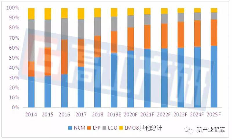 2014-2025中國(guó)各類型正極材料產(chǎn)量占比(單位:%)