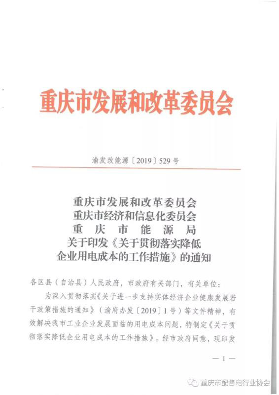 2019年4月28日,重慶市發(fā)改委、經(jīng)信委、能源局聯(lián)合印發(fā)了《關(guān)于貫徹落實降低企業(yè)用電成本的工作措施》(渝發(fā)改能源 [2019]529號,以下簡稱工作措施)的通知。該文件是落實重慶市政府一號文《關(guān)于進一步支持實體經(jīng)濟企業(yè)健康發(fā)展若干政策措施》(渝府辦[2019]1號)的配套舉措。根據(jù)渝府辦[2019]1號的要求,從發(fā)電、輸配、政府基金及附加、用戶四端共同發(fā)力,將產(chǎn)品有市場的重點工業(yè)企業(yè)用電價格降低到0.6元/千瓦時左右?!豆ぷ鞔胧吩诖吮尘跋鲁雠_,強調(diào)了通過市場機制降低工商企業(yè)用電成本。注意到,文中強調(diào)的“成本”包含但并不局限于用電“價格”,而是從資產(chǎn)管理、優(yōu)化運營、用戶服務(wù)等多維度為企業(yè)減負,提升企業(yè)獲得感。