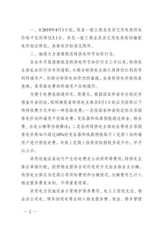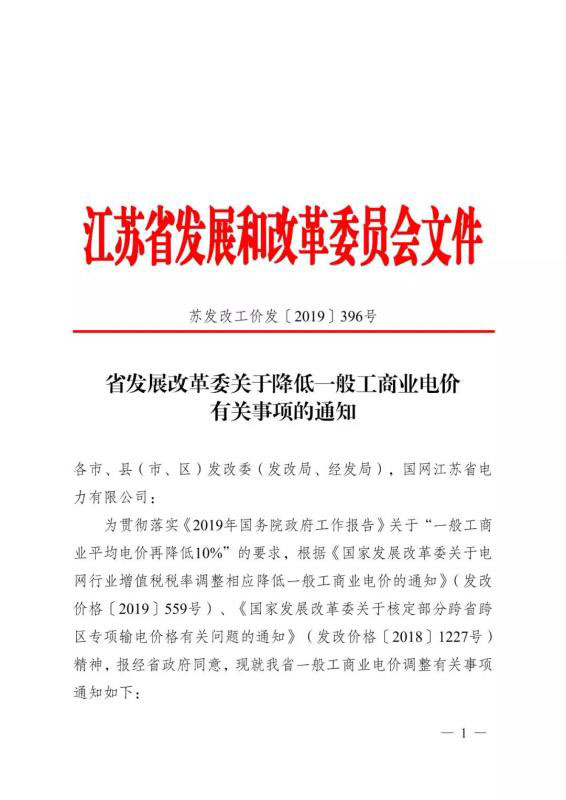 4月29日,江蘇發(fā)改委正式印發(fā)《省發(fā)展改革委關(guān)于降低一般工商業(yè)電價(jià)有關(guān)事項(xiàng)的通知》。自2019年4月1日起,江蘇省一般工商業(yè)及其它用電類(lèi)別電價(jià)每千瓦時(shí)降低3.1分。涉及一般工商業(yè)及其它用電類(lèi)別的輸配電價(jià)相應(yīng)降低。