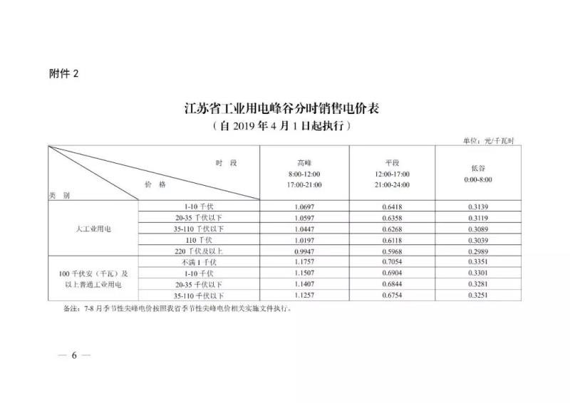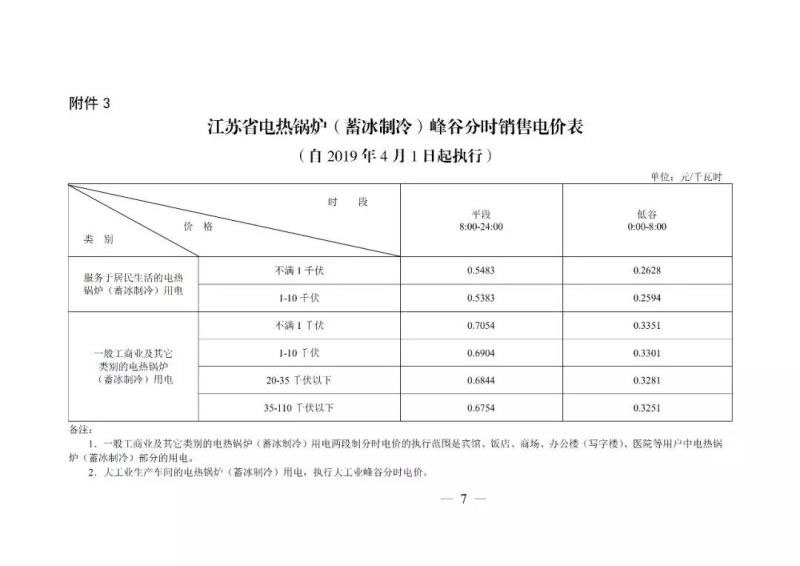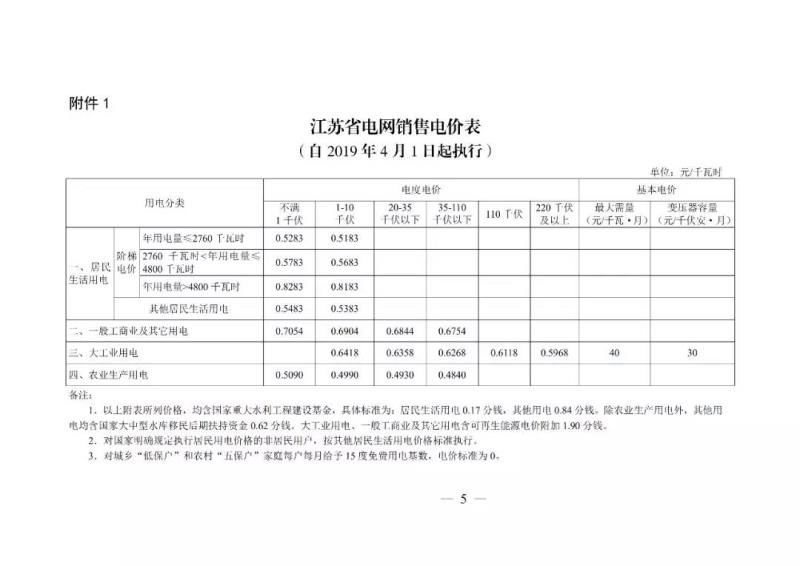 2019年4月1日起執(zhí)行的江蘇省電網(wǎng)銷(xiāo)售電價(jià)表。單位:元/KWh。
