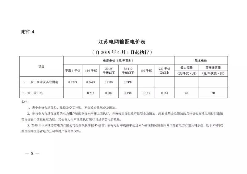 2019年4月1日起執(zhí)行的江蘇電網(wǎng)輸配電價(jià)表。
