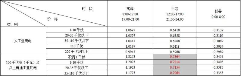 2018年9月1日起執(zhí)行的工業(yè)用電峰谷分時(shí)電價(jià)表。單位:元/KWh