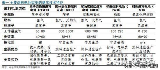 燃料電池(Fuel cell)是一種主要通過氧或其他氧化劑進(jìn)行氧化還原反應(yīng),把燃料中的化學(xué)能轉(zhuǎn)換成電能的發(fā)電裝置。最常見的燃料為氫,其他燃料來源來自于任何的能分解出氫氣的碳?xì)浠衔铮缣烊粴?、醇、和甲烷等。燃料電池有別于原電池,優(yōu)點(diǎn)在于透過穩(wěn)定供應(yīng)氧和燃料來源,即可持續(xù)不間斷的提供穩(wěn)定電力,直至燃料耗盡,不像一般非充電電池一樣用完就丟棄,也不像充電電池一樣,用完須繼續(xù)充電。主要燃料電池類型的技術(shù)特征見表一: