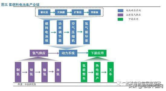 氫能及燃料電池產(chǎn)業(yè)鏈主要包括上游氫氣供應(yīng)的制氫、儲氫、輸氫和加氫環(huán)節(jié),燃料電池動力系統(tǒng)本身的各個技術(shù)環(huán)節(jié),以及下游的氫能整車等應(yīng)用環(huán)節(jié)。其中,氫氣供應(yīng)是保證燃料來源的關(guān)鍵,燃料電池堆是產(chǎn)業(yè)鏈的核心,燃料電池動力系統(tǒng)是燃料電池應(yīng)用的重要載體,燃料電池整車為燃料電池技術(shù)發(fā)展的最終目的。氫燃料電池車產(chǎn)業(yè)鏈見圖五: