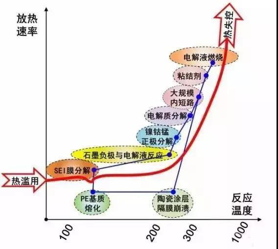 熱失控是鋰電池危害程度最高且難以預(yù)測(cè)的風(fēng)險(xiǎn),當(dāng)電芯受到外力破壞引起短路或內(nèi)部發(fā)生短路、過充情況時(shí),電芯內(nèi)部的溫度便隨之上升,一旦升至130度,SEI膜便開始崩解,并造成有機(jī)電解液直接與高活性正負(fù)極接觸,因而大量發(fā)生分解放熱反應(yīng),導(dǎo)致溫度與內(nèi)壓提速上升、大量氣體產(chǎn)生造成電池快速膨脹,到達(dá)臨界溫度后正極崩解,釋放出更多熱能及氧氣,諸多因素迭加后造成升溫、分解、放熱的連鎖反應(yīng)加劇,終至起火爆炸。