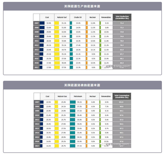 美國總體能源消費量同比增加了0.2%,為97.7千兆英熱單位(Quadrillion Btu)。同2016年相比,2017年可再生能源和石油的能源消費量分別增加7.4%和0.6%。相反,天然氣和煤炭的消費量分別減少0.1%和0.6%。