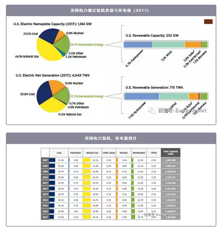 美國2017年可再生能源電力增至總裝機容量的19.7%以及總發(fā)電量的17.7%。在2017年,可再生電力裝機容量超過232吉瓦(GW),發(fā)電量為715太瓦時(TWh)。